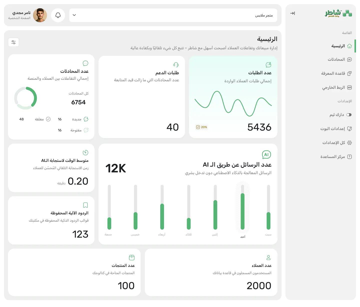 كل تفاعل يجعل شاطر كثر ذكاءً! يتعلم من العملاء، يطور ردوده، ويصبح أكثر قدرة على إقناعهم بالشراء.